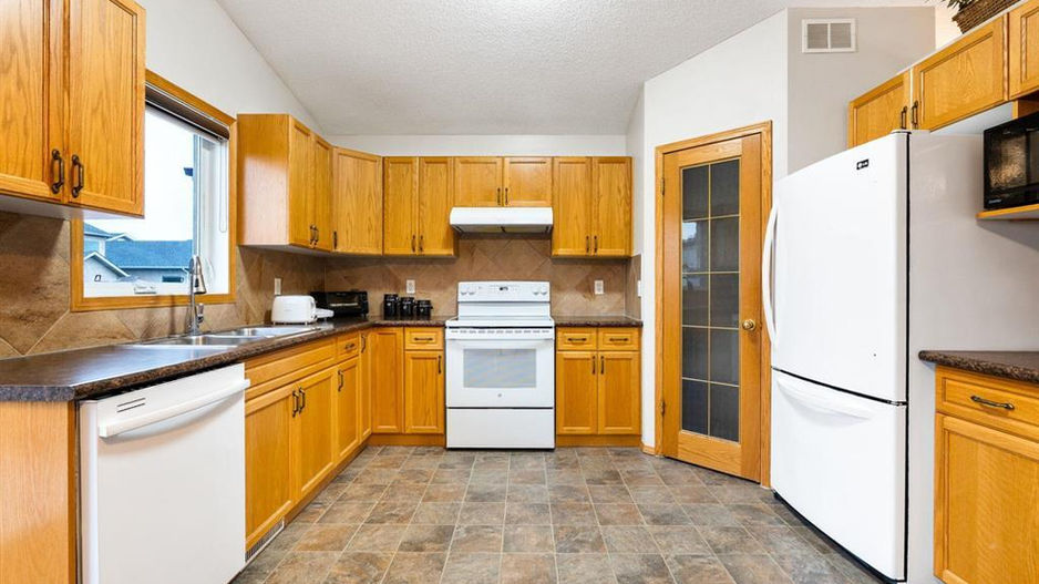 Welcome to this beautiful cab-over home boasting 1,740 sq.ft. of living space also offering five bedrooms and three full bathrooms in the highly sought-after community of Amber Trails. Main level features a bright and spacious living/dining room, a large eat-in kitchen with oak cabinetry and walk-in pantry, as well as a 4 piece full bathroom. The main floor also offers two additional well-sized bedrooms and a full 4-piece bathroom. The primary suite is located on its own level and includes a walk-in closet with a 4-piece ensuite bathroom. A fully finished basement built in 2019 with a large recreation room, two bedrooms, a full bathroom with tiled flooring and a laundry room. Built on piles for lasting durability, this home also includes an insulated double attached garage and a nicely landscaped fenced yard with a large 16 x 16 deck. New vinyl plank flooring on main floor & master bedroom bedroom, interior paint in 2024. Situated close to schools, parks, shopping, and all amenities.